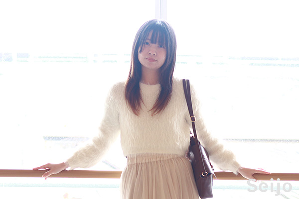 コーデポイントは春なのでピンクのロングスカートや白のニットで明るくしてみました。